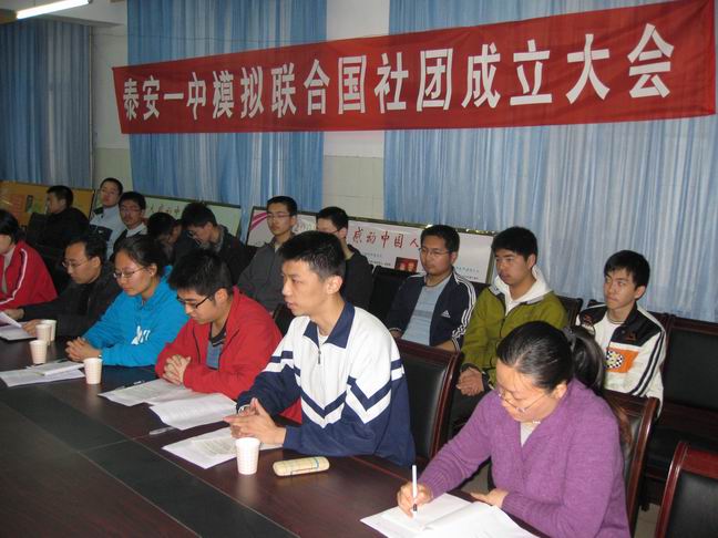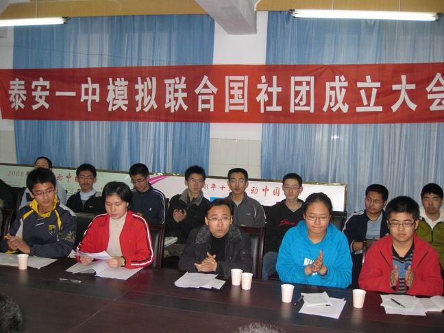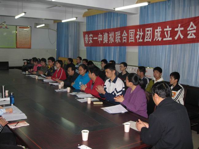 2009年3月21日,泰安一中模拟联合国学生社团在泰安一中团校召开了成立大会,会议由高一学生会主席封蔚然同学主持。模拟联合国学生社团团长代表社团成员宣读了社团宗旨、章程、活动计划。李秀笃副校长、张玉良副主任到会表示了热烈祝贺。成立仪式结束后,模拟联合国学生社团开展了第一次活动,活动的议题是“联合国千年计划之环境保护”。指导教师刘元国老师对活动作了有针对性的指导和点评。