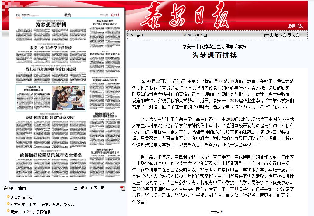 泰安日报:泰安一中2019届优秀毕业生李令哲寄语学弟学妹