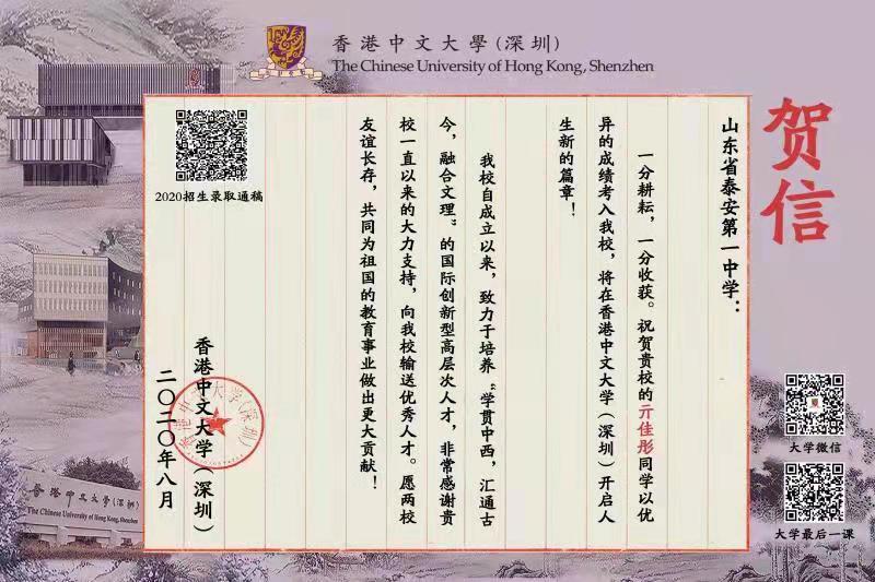 亓佳彤,2017级校友,20179月—20206月就读于泰安一中,2020年考入香港中文大学学习。